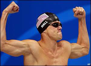 U.S. swimmer Gary Hall Jr. flexes for the crowd prior to competing in the men's 50m freestyle.