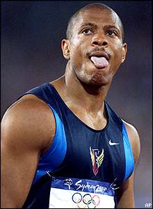 USA's Maurice Greene sticks out his tongue as he checks his time after his second round heat of the men's 100m race .